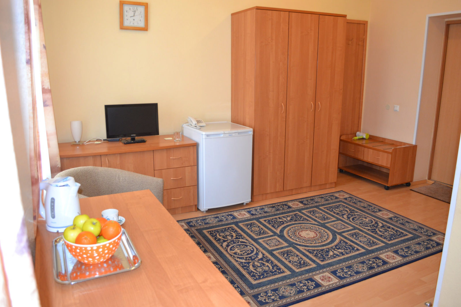 Площадь номера - 24 кв.м. 1 осн. место. 1 доп. место. Мебель: вешалка, кресла, кровать односпальная, стол, столик журнальный, шкаф. Оборудование: кондиционер, телевизор, телефон, холодильник. Санузел: с ванной, фен. Сервис: смена полотенец, смена постельного белья, уборка номера.